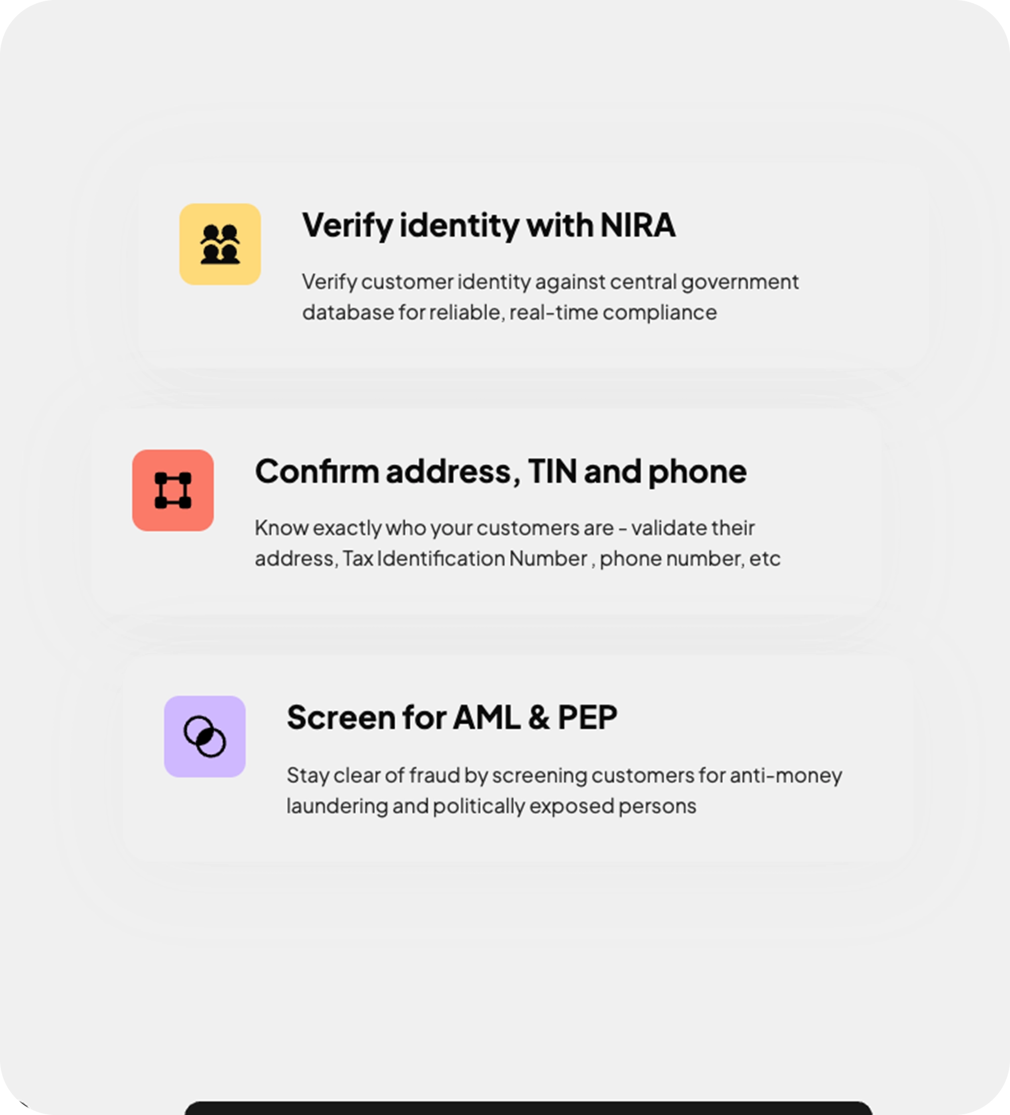 national IDs, and TINs. Screen for AML/CFT and politically exposed persons (PEPs).